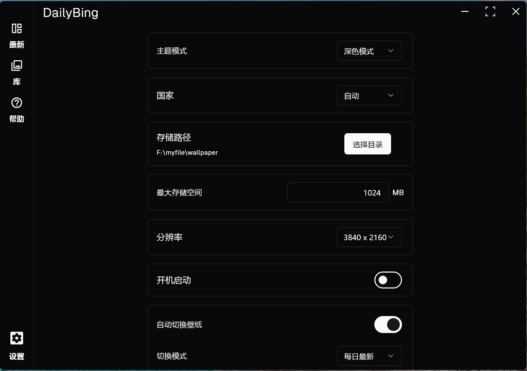 - 全自动下载:设定地区后,工具每日自动抓取对应壁纸,无需手动操作,适配3840×2160(4K UHD)、2K、1080P等全分辨率屏幕,高清原图直接适配桌面。